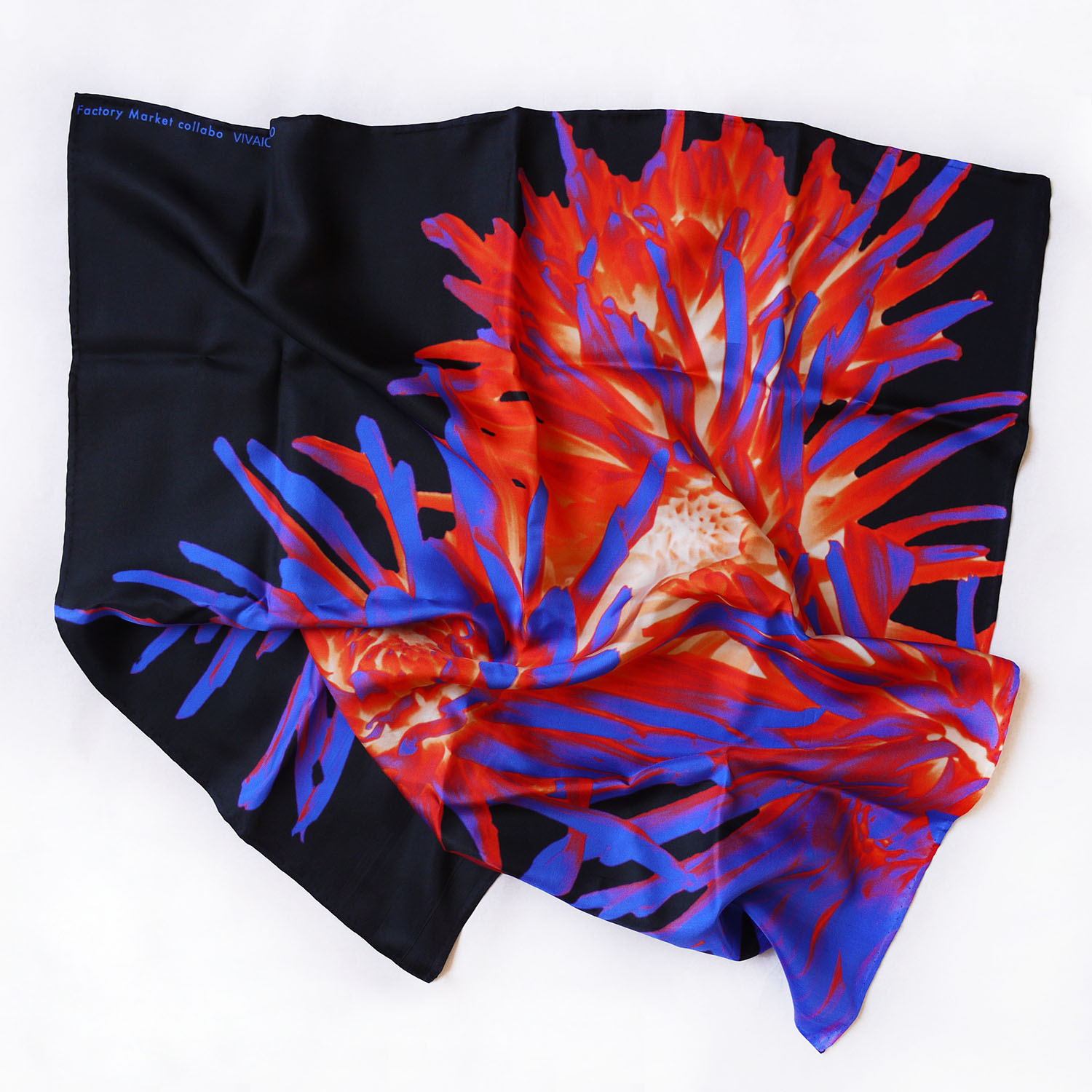 L’ artwork dei foulard, ispirato ad alcune immagini notturne scattate a raggi ultrarossi, è caratterizzato da forti contrasti e colori onirici e soprannaturali, che la seta, sulla quale i fiori sono stampati in una visione macro, rende ancora più vivi e armoniosi con la base scura ispirata al cielo notturno.